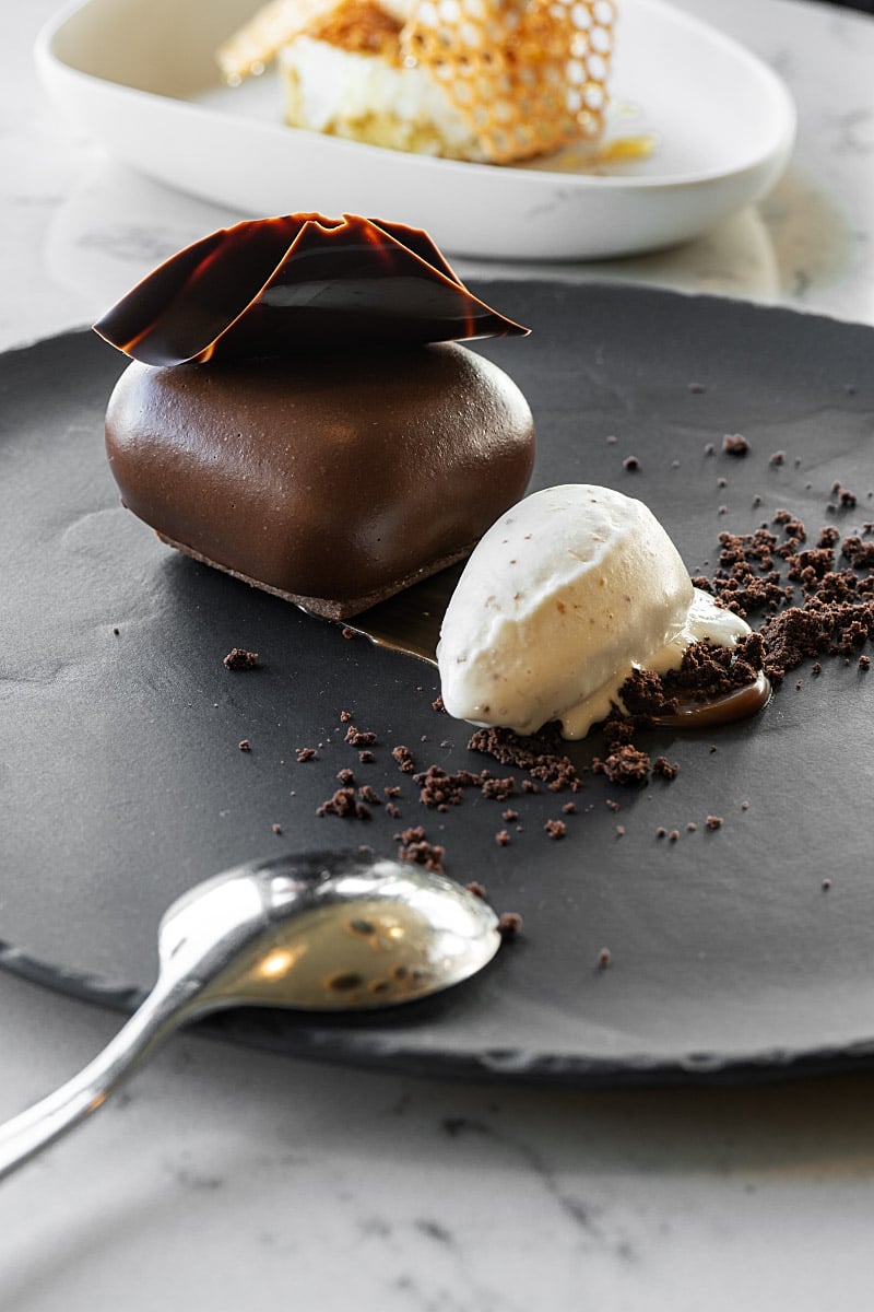 For chocolate lovers, this is the obvious choice. A rich chocolate mousse with a deep, direct flavour, paired with a glossy chocolate glaze. Rum ice cream and melted caramel pushed it further, but everything came together best with roasted hazelnuts and a chocolate cookie for texture.