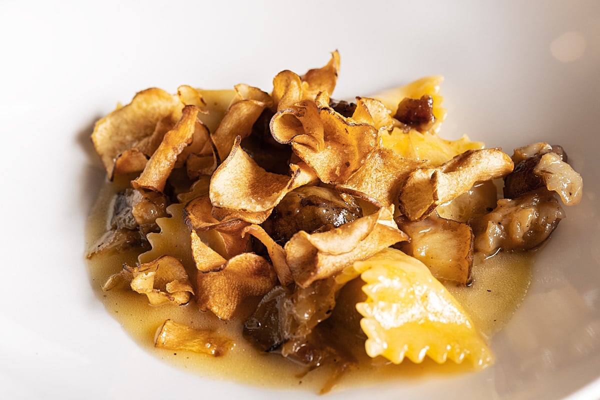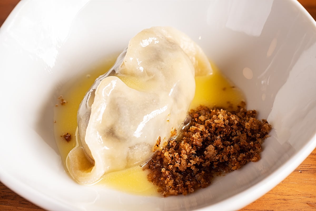 “Jamar”, cheese aged in a cave, does get incredible characteristics, with grounding being the most obvious one. Naturally, the Italian cave from Emilia-Romagna gave a unique twist to the aged Tolmin cheese. A change so intense that its full flavour and aroma worked wonders in the mousse-like filling. A soft, cheesy essence melted away almost too quickly, leaving us with a wish for more. Perfectly cooked egg pasta made in the Piedmont way was a lovely, toothsome addition as well. As if that wasn’t enough, sudden bursts of sweet, nutty chunks of Jerusalem artichoke bathed in brown butter emulsion revealed new heights. Gotta admit, we have never had Jerusalem artichoke as good as here – respect.