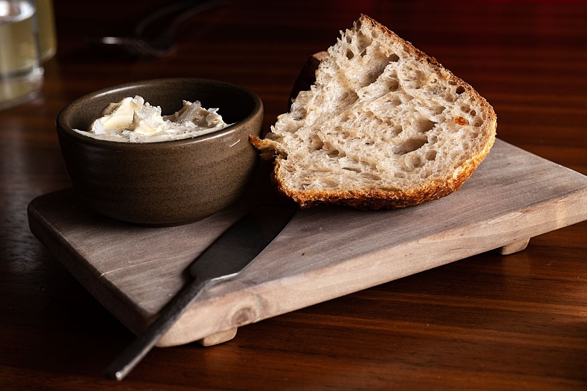 Mountain butter that is whipped into a cloud of every butter-lover’s delight. But not just whipped, also seasoned with flower honey and peanut miso. A combination so delicious it kept changing with every bite. Everything started in a nutty fashion and continued towards dried fruits. Here and there, an explosion of the “Fleur de sel” came along. A slow-fermented sourdough bread is a story for itself and an absolute delight. This bread returned us to Hisa Franko, immediately.