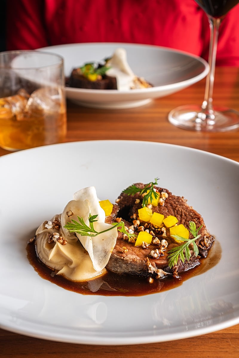 Slow-cooked beef ended up being succulent, tender, and also quite generously seasoned with salt. It was a fantasy to pair it with smooth celeriac puree made with caramel butter. Lusciously mouthwatering was also the chocolate jus, topped with aromatic spices like cinnamon and star anise. Whenever we combined the bite with lively pickled celeriac, the flavour expanded even more.