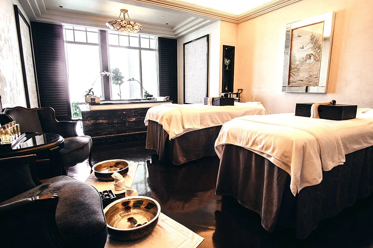 Couples massage room at E&O hotel Panpuri Spa with jacuzzi next to the window.