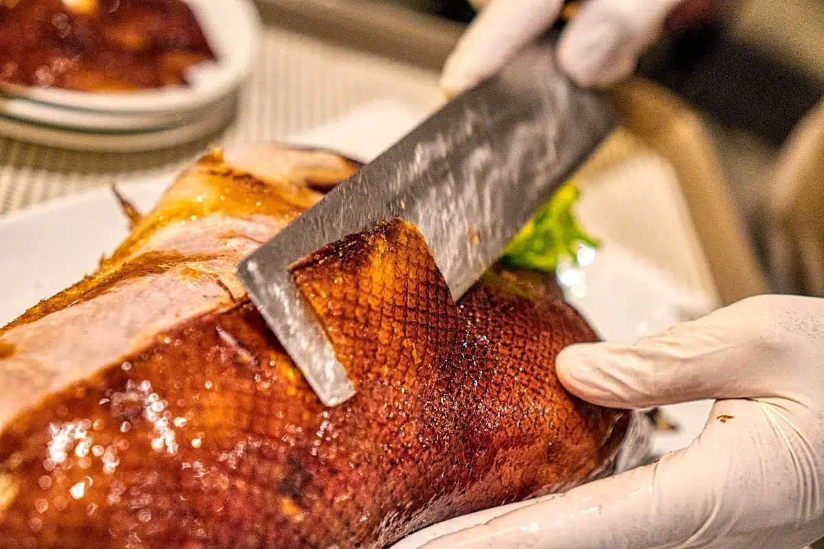 After that, the whole duck gets a boiling bath, spiced with five Chinese spices. For tighter skin, the duck must dry before its skin gets another special treatment in the form of seasoned maltose syrup. Then the inside gets another boiling splash following the application of sweet spiced glaze for more flavor. Glazed duck from all sides gets a solid rest that can take for up to a few days, but usually, one day is enough, before roasting.