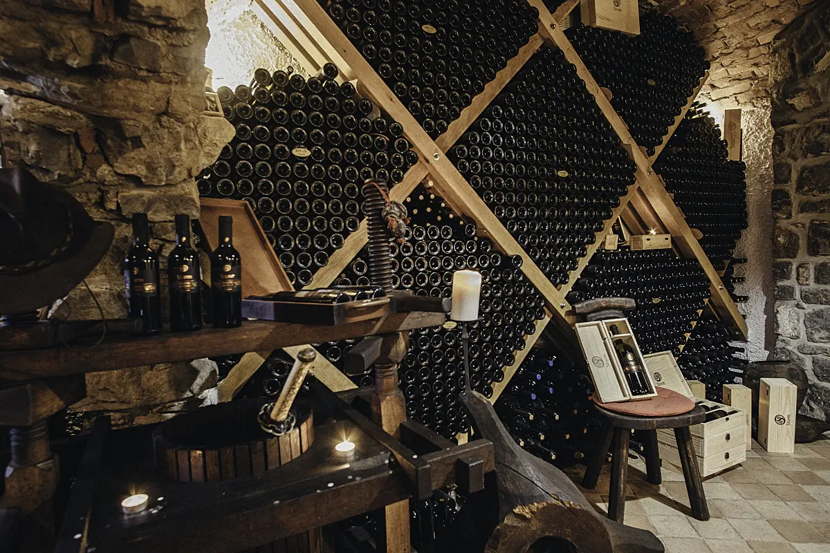 Neatly stored wine bottles inside the original part of Sturm wine cellar.